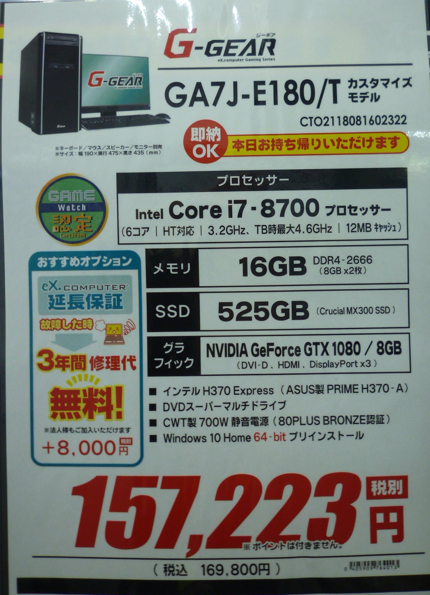 ツクモdos Vパソコン館 On Twitter 2f G Gear 本日より販売開始しましたg Gear Ga7j E180 T カスタマイズモデル Core I7 8700にメモリ16gb Ssd525gbとgtx1080を搭載して なんと税別157 223円 こちらも台数に限りがございます ご検討のお客様はぜひツクモ