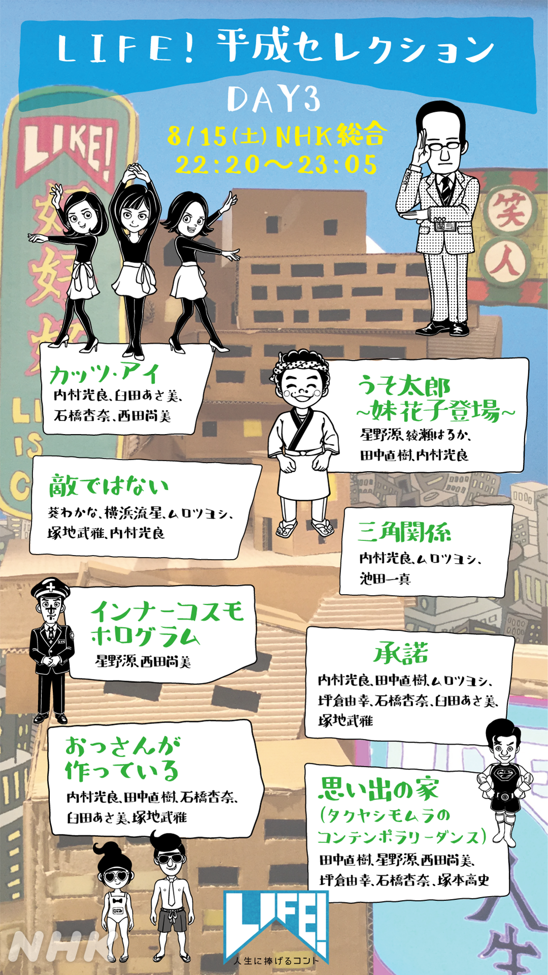 Life 人生に捧げるコント On Twitter 三津谷です あす8 土 から三夜にわたって放送する Life 平成セレクション 8 15 土 夜10 20 放送のday3ラインナップを発表 豪華ゲストがそろい踏み 星野の源氏の大人気コント うそ太郎 に綾瀬のはるか氏が出演 横浜の